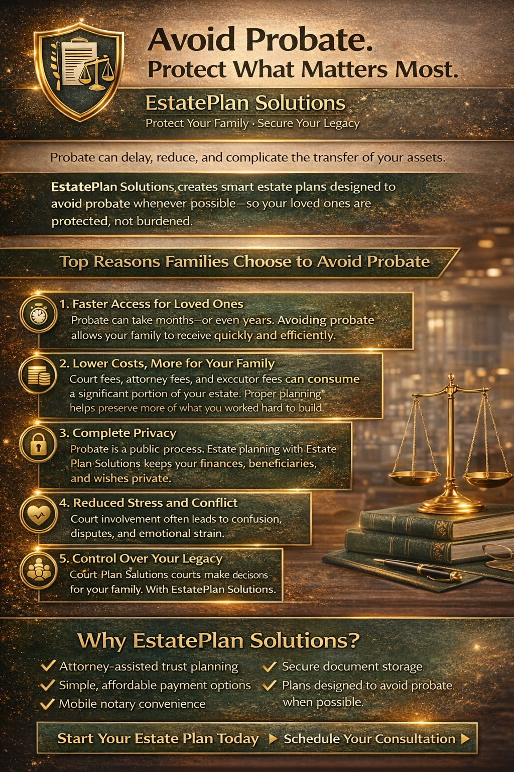 EstatePlan Solutions makes estate planning simple, affordable, and stress-free—so your loved ones are protected without unnecessary delays or public court involvement.